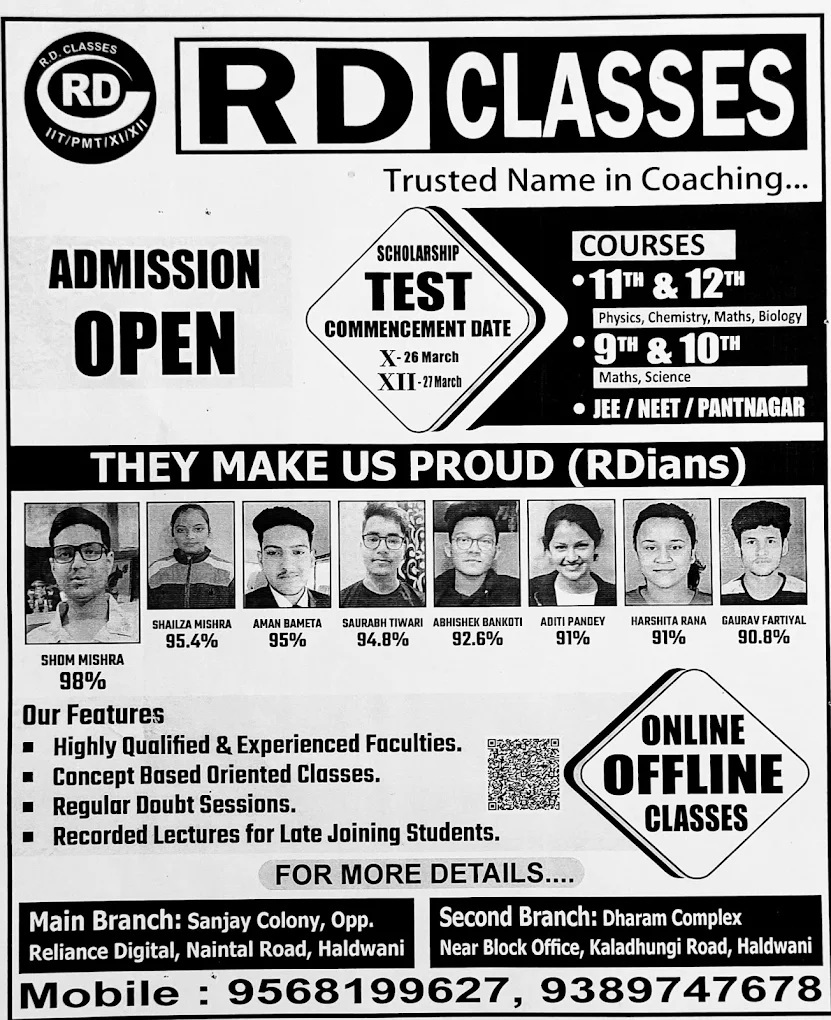 RD Classes (also known as RDians or RD Learning Planet) is a highly-rated educational institution in Haldwani, known for its dedication to providing quality and affordable coaching. The center operates with multiple branches in the area, including Gopipuram Colony, Halduchaur, and near the Railway Crossing, Halduchaur.