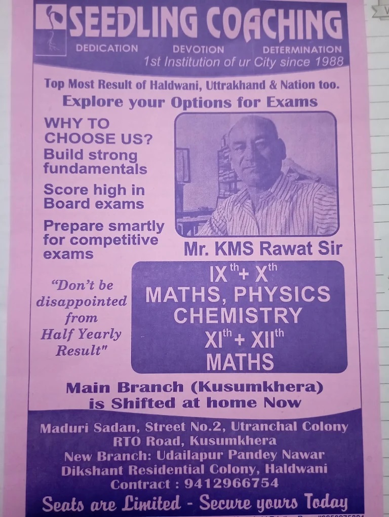 Seedling Coaching is a highly-rated and well-established educational institution in Haldwani, located in Kusumkhera on RK Tent House Road, near Abdulla Petrol Pump.With an established presence in the field since 1988 by its founder, the institute brings deep experience in academic and competitive training.